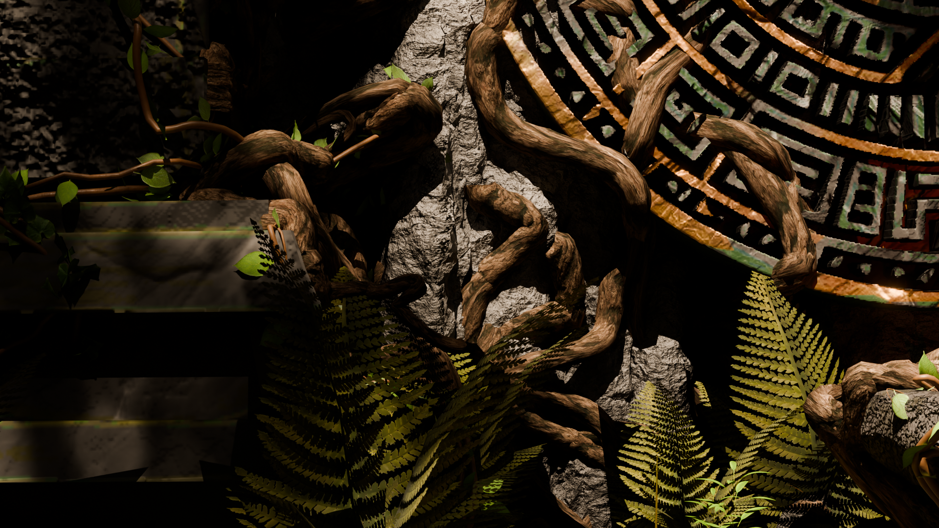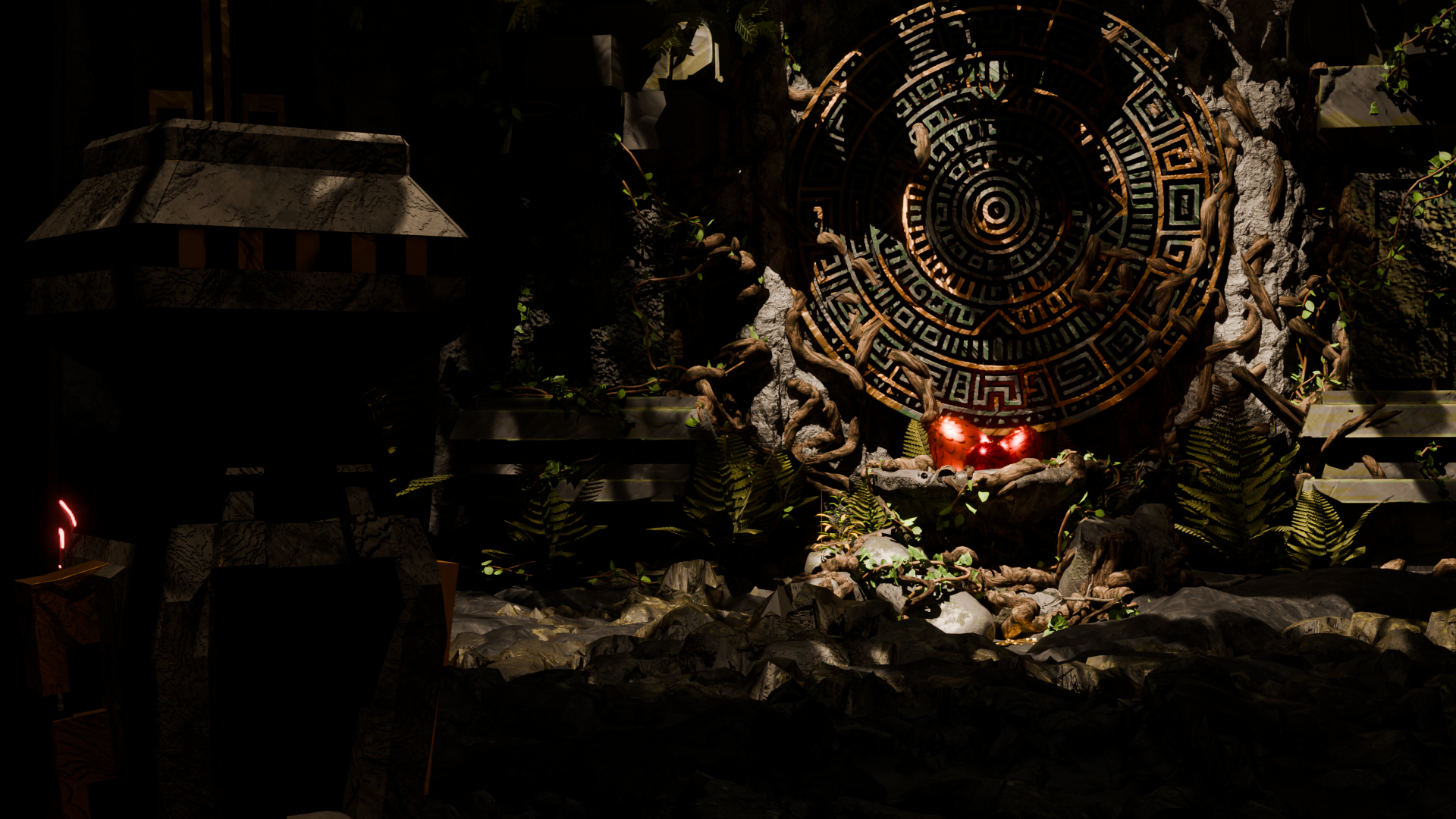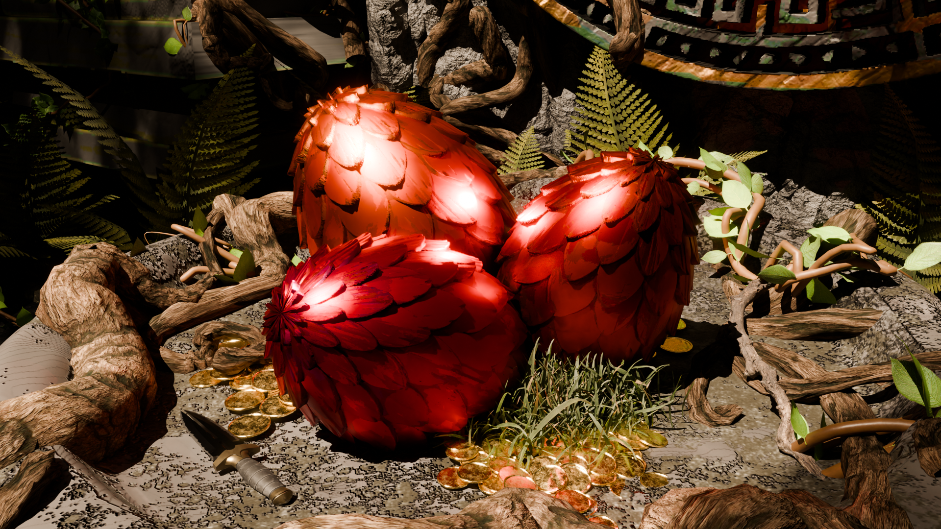 The environment combines elements of an overgrown mountain cave and an ancient temple. At its center lies an altar-like cradle filled with dragon eggs, emphasizing the magical aspect of the project and linking the setting to the character’s backstory.