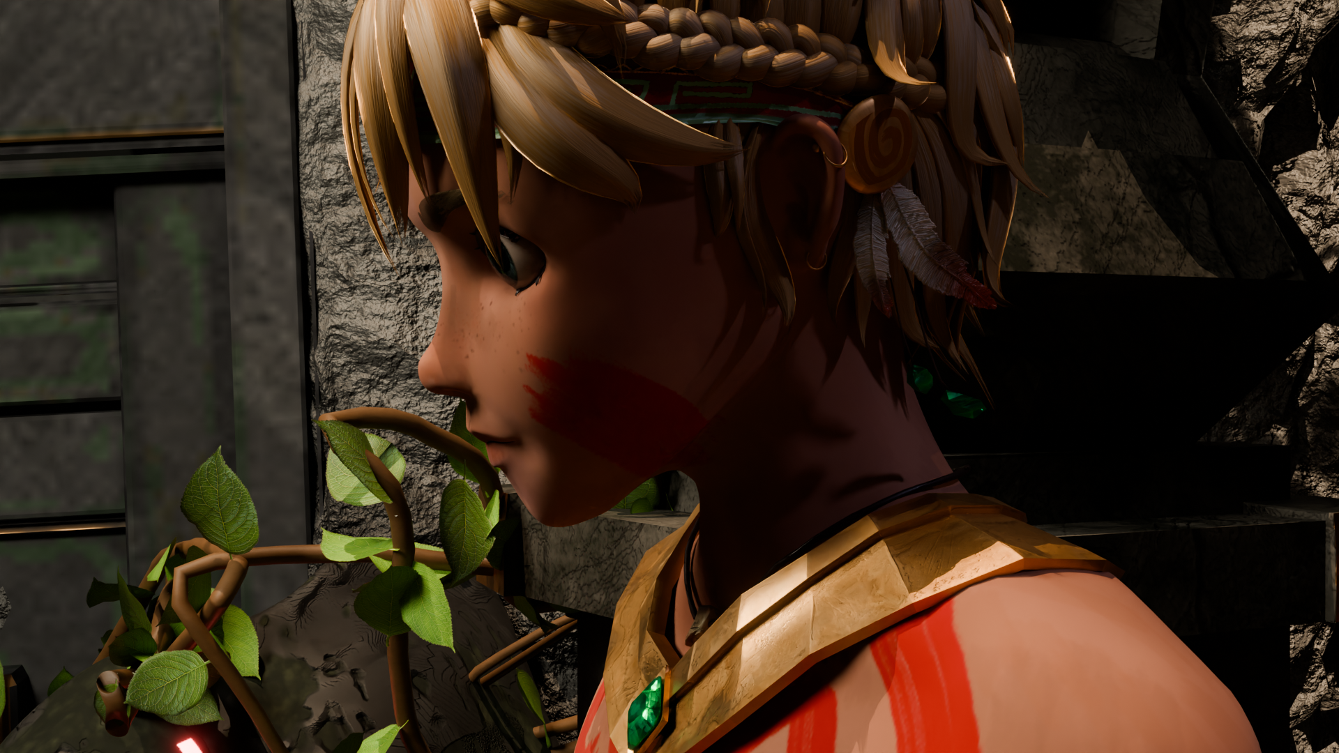 The idea was to create a young, adventurous boy inspired by Aztec culture. I wanted him to embody a bold, playful, and colorful spirit that would harmonize aesthetically with the surrounding environment. I named him "Koh", as a reference to the coyote — a symbol of trickery and mischief in ancient Mexican mythology.
